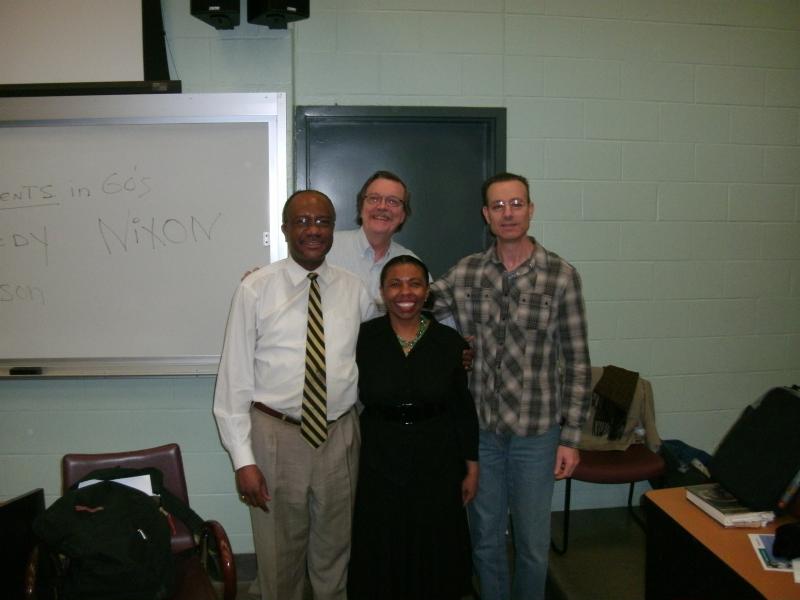 TOP -- Felicia with some of the Bloomfield College faculty members. She was a guest lecturer for the Social Responsibility class at the invitation of Adjunct Professor Glenmore Bembry, far left. Professor Bembry, who is pastor of Trinity Baptist Church in Brooklyn, New York, focuses on religious aspects of social responsibily for the team-taught course. Second from left is Professor Glen Hayes, professor of religion and head of the Religion Department. On the far right is Professor Demetris Nicolaides, professor of physics, head of the Physics Department and coordinator of the Sophomore Core.