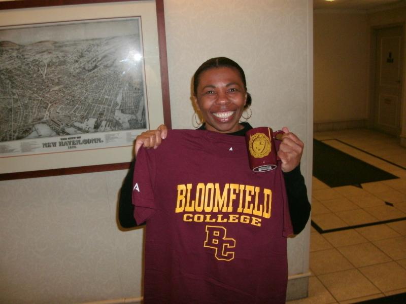 BOTTOM -- Felicia holding a T-shirt and mug, a couple of souvenirs from her visit to Bloomfield College, courtesy of the Humanities Department.
